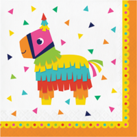 - 16 Lunch Napkins: Folded size of 16.5cm x 16.5cm Approx. Paper, 2 Ply Square. These Napkins feature a white background with an image of a Donkey Pinata surrounded by colourful Confetti Triangles.