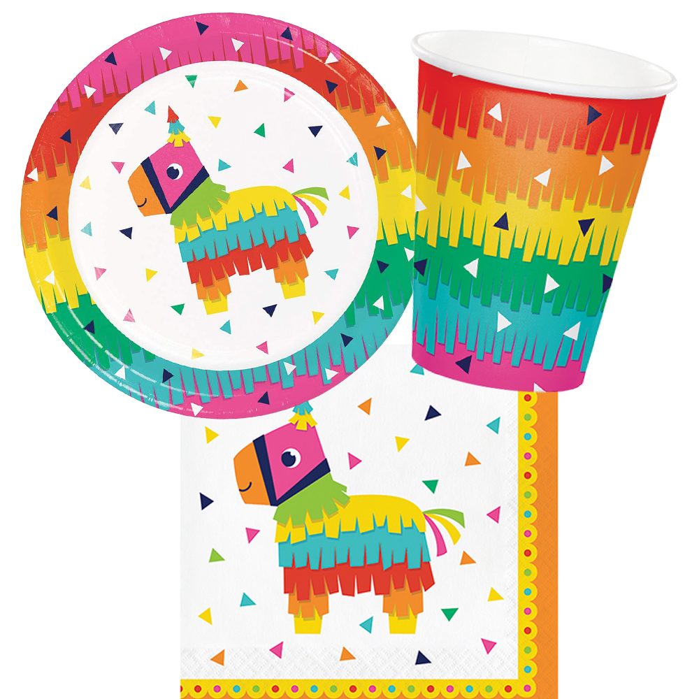 This Fun Bright Tableware Pack will look amazing at your Mexican Fiesta themed celebration! Decorate your Party Table or buffet table with these Colourful Tableware Products. The Cups feature Colourful strips to resemble Red, Orange, Yellow, Green, Blue and Pink Strips of Pinata Tissue Paper and the Napkins and Plates feature a Donkey Pinata. Such wonderful, Colourful Tableware!!!!