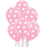 - 1x Packet of 12 Latex Balloons: Made of Latex. Ready to fill with air or helium. Balloons are supplied uninflated. Light Pink Colour Latex Balloons with White Polka Dots all over.