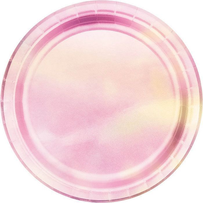 - 2x 8 Lunch Plates (16 in Total): Foil Paper Iridescent Plates. Measure 17.7cm Approx. Featuring a Pink Gold Colours
